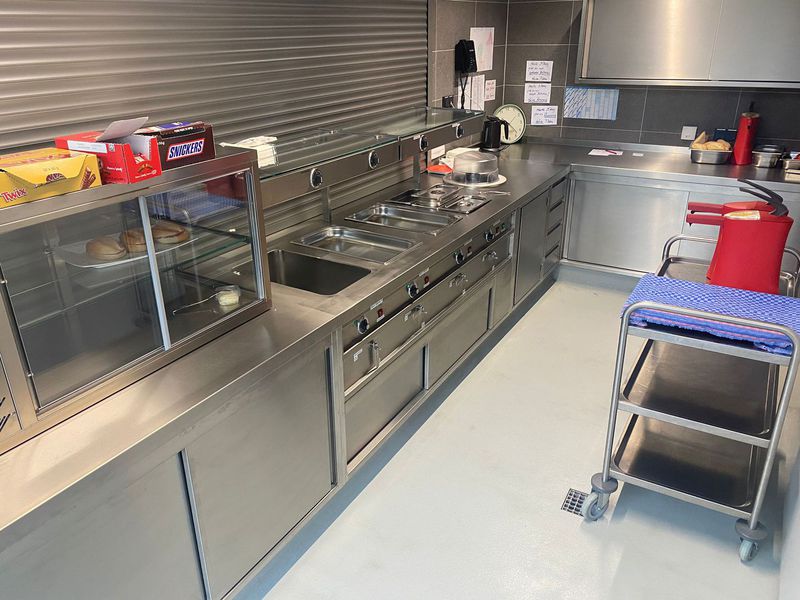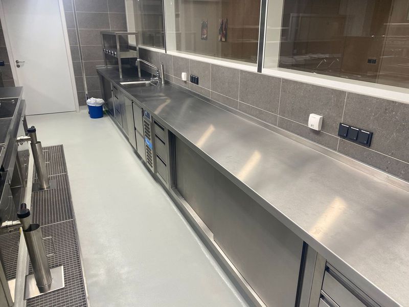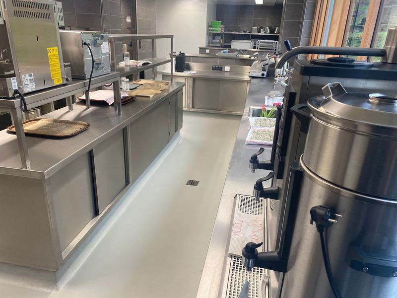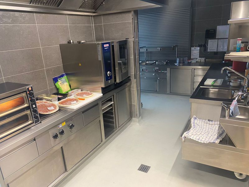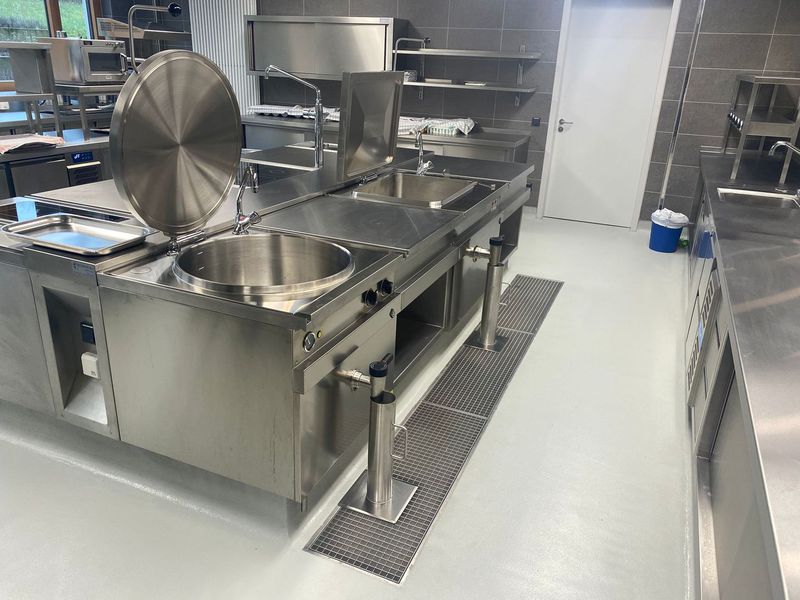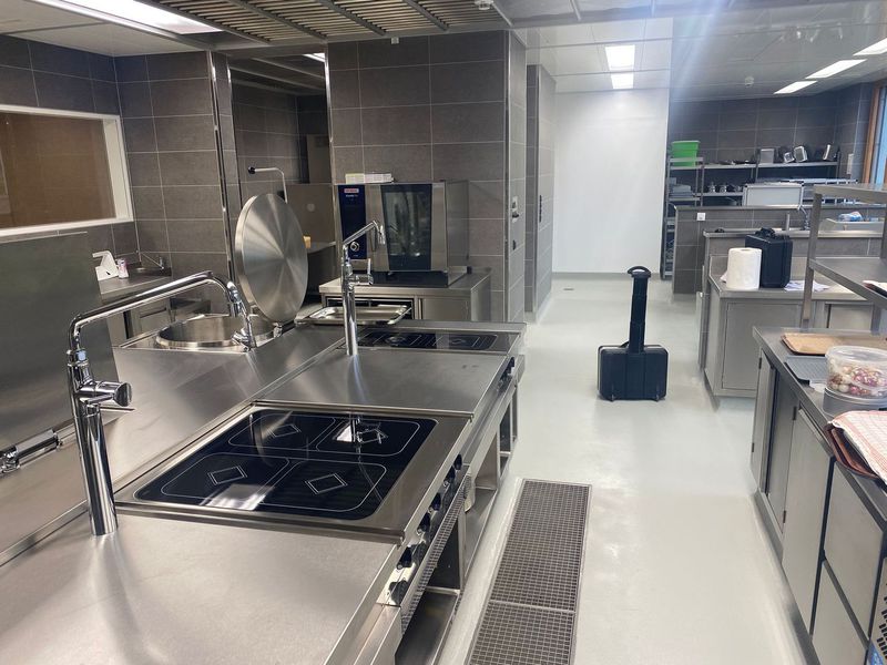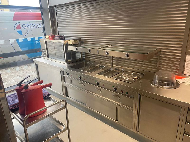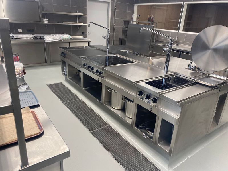 Der neue MKN-Kochblock wird durch Kombidämpfer von Rational ergänzt. Spül- und Kühltechnik wurden von Meiko bzw. Cool Compact geliefert. Die Speisenausgabe sowie die Edelstahl-Möbel wurden in unserer eigenen Fertigung hergestellt.
